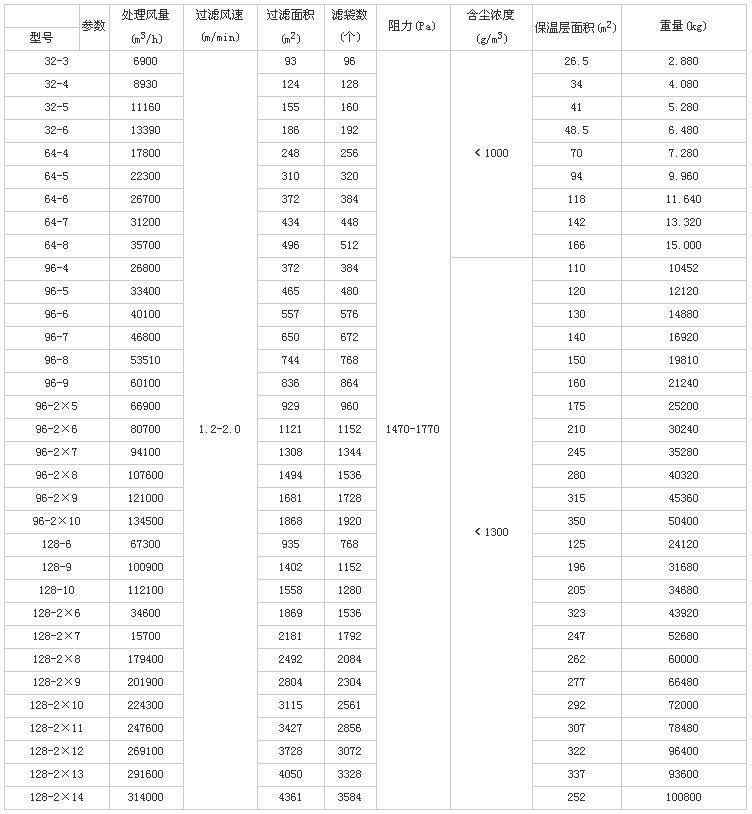 本系列產品共有33種規格,每室的袋有32、64、96、128袋四種,濾袋長度有2450mm和3060mm兩種,收塵效率可達99.9%以上,凈化后氣體的含塵濃度小于100mg/m3(標)本系列收塵器如用于寒冷地區,當室外采暖計算溫度≤-25℃時,要設熱裝置。