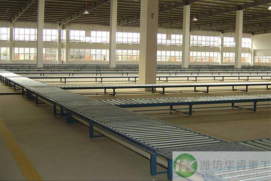無動力輥筒輸送機:無動力滾筒輸送機又稱輥道線。依靠輥筒來完成輸送,適用于各類箱、包、托盤等件貨的輸送,散料、小件物品或不規則的物品需放在托盤上或周轉箱內輸送。有長輥道和短輥道兩種。長輥道的輥子表面形狀有圓柱形、圓錐形和曲面形幾種,以圓柱形長輥道應用最廣。輥道的曲線段采用圓錐形輥子或雙排圓柱形輥子,可使物品轉彎。短輥道可以縮短輥子的間距,自重較輕。輥道一般稍下傾,當物品較重、線路較長時,為了推動物品時省力,斜度可取1~1.5%。如要使物品自滑,斜度可增大到2~3%。影響自滑斜度大小的因素很多,大多用實驗確定合適的角度。當線路長度小于10米、物品輕于 200千克時,可以布置成水平線路。自滑式輥道不易控制物品下滑速度,所以長度一般不大。輥道的寬度比物品寬度大100~150毫米。曲線段最小曲率半徑為輥道寬度的3~4倍。輥子間距為輸送物品長度的1/3~1/4,當物品輸送的平穩性要求較高時。間距可取輸送物品長度的1/4~1/5。輥子直徑按載荷大小決定。